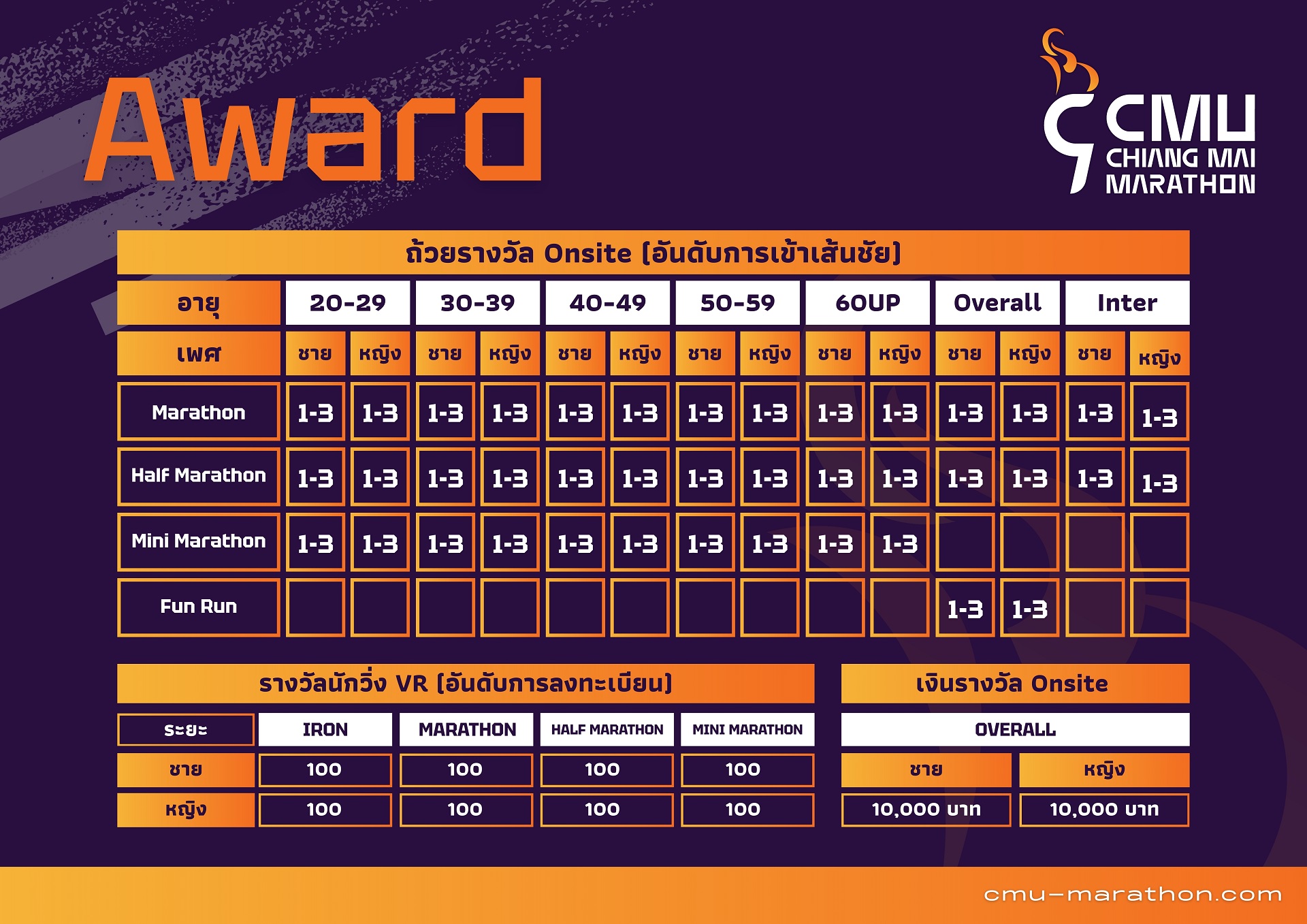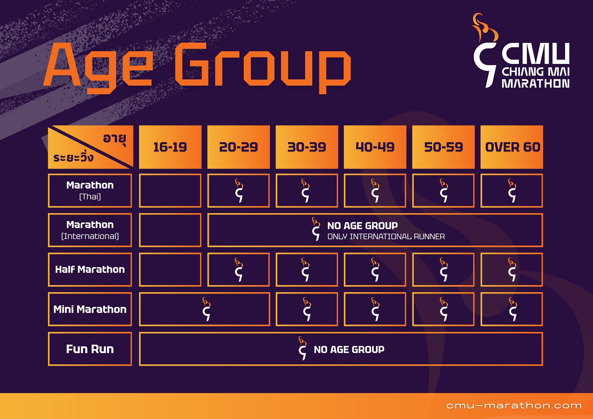 - มาราธอน 42.195 km (ผู้มีสัญชาติไทย) :: 20-29 ปี , 30-39 ปี , 40-49 ปี , 50-59 ปี , ตั้งแต่ 60 ปีขึ้นไป